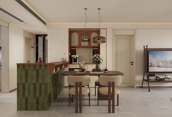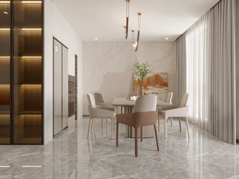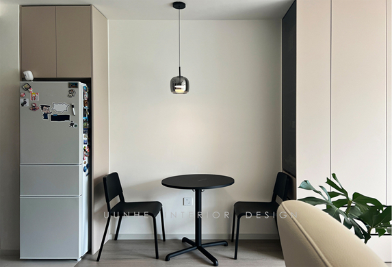 空間整體用色較為淡雅的奶白色 暖灰色系的柜體搭配鋼玻隔斷 餐桌吊燈+鋼玻裝飾柜形成空間一景 增強空間的功能分區的同時不失空間的聯動性