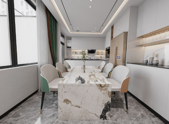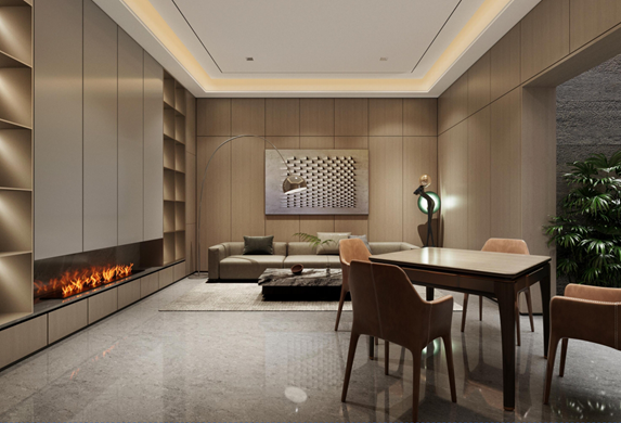 本案為一座580平米的意式輕奢風格別墅,將現代簡約與奢華質感完美融合。入戶區域便定調了整個空間的非凡氣度:對稱式的高大木質收納柜沉穩大氣,其間形成的通透走廊自然地引導視線向內